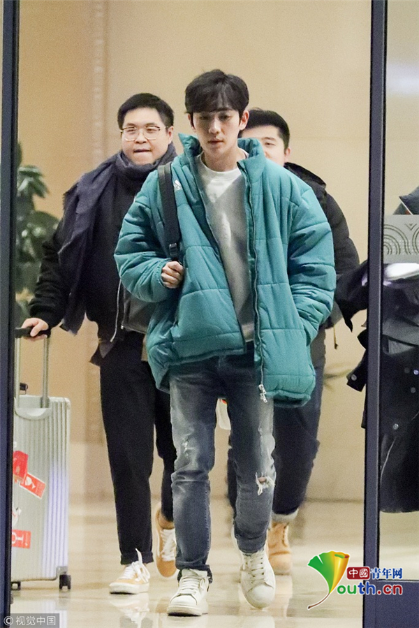 1月15日,北京,朱一龍現(xiàn)身機場。他穿綠色棉襖一路插兜保暖,搭配破洞褲潮范兒十足長腿搶鏡,打扮簡單毫無男神包袱,看鏡頭還一臉呆萌,但氣質仍然出眾。