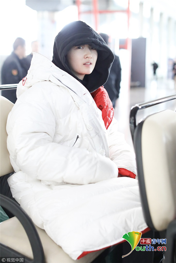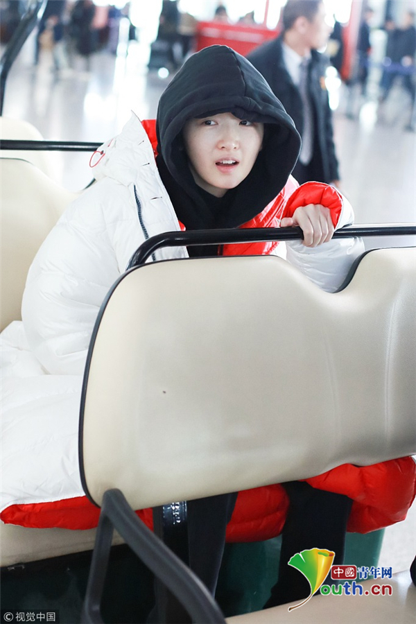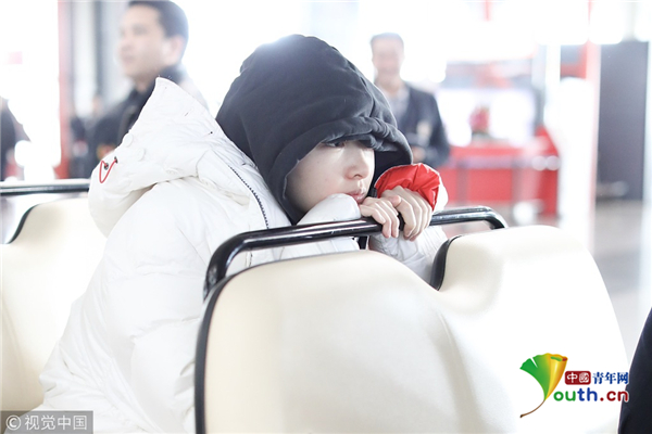1月23日,北京,周冬雨現(xiàn)身機(jī)場。她用黑色連衣帽罩頭襯托巴掌臉,把下巴擱在行李車推桿上的雙手上呆萌可愛 。
