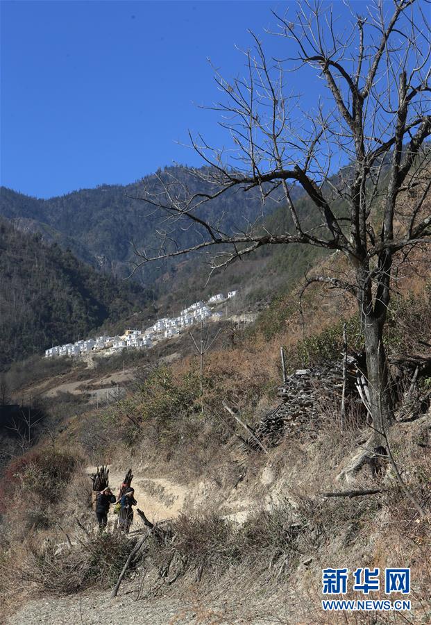1月25日,在云南省蘭坪縣,余永妹(右)和褚福妹背柴回家,遠(yuǎn)處是她們即將易地搬遷的新居。