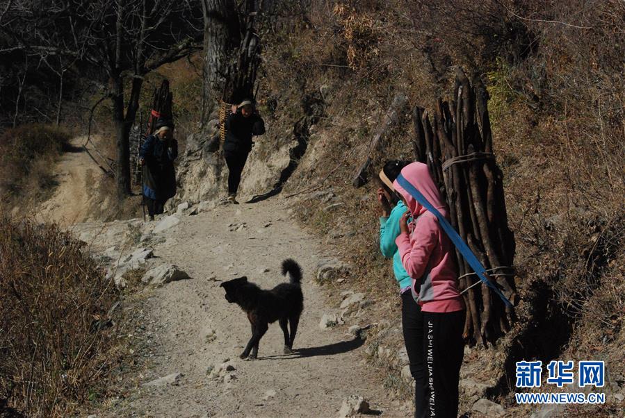 1月25日,在云南省蘭坪縣,余永妹(左一)與孩子們背柴回家。