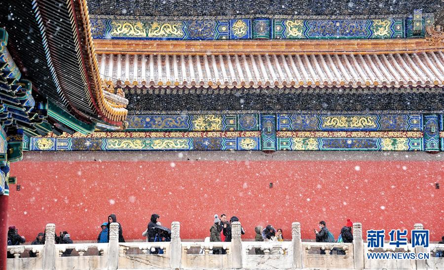 2月14日,游客在雪中游覽北京故宮。 當日,北京降雪,大批游人來到故宮游覽賞雪。 新華社記者 李欣 攝