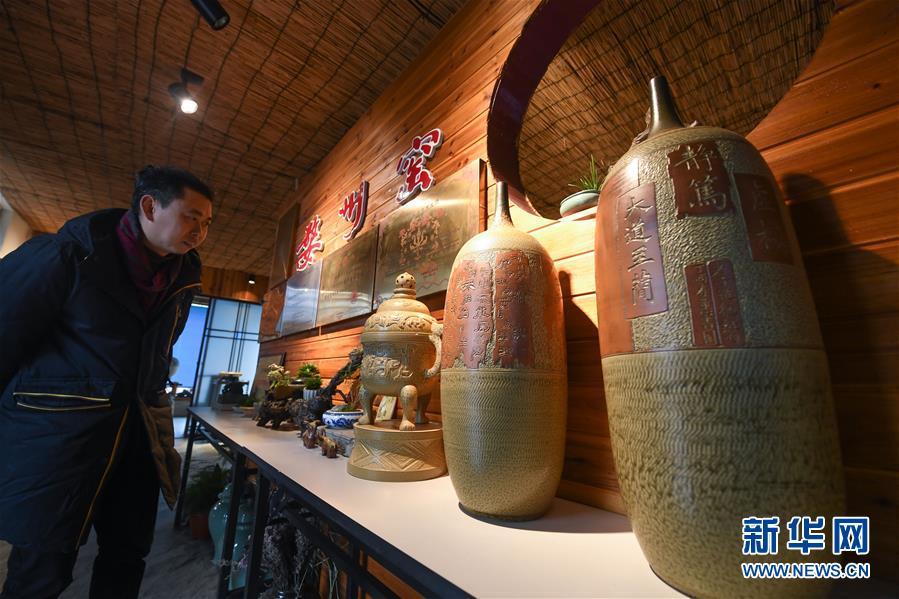 2月16日,一名游客在婺窯小鎮(zhèn)陳新華的工作室內(nèi)觀看婺州窯作品。新華社記者 徐昱 攝