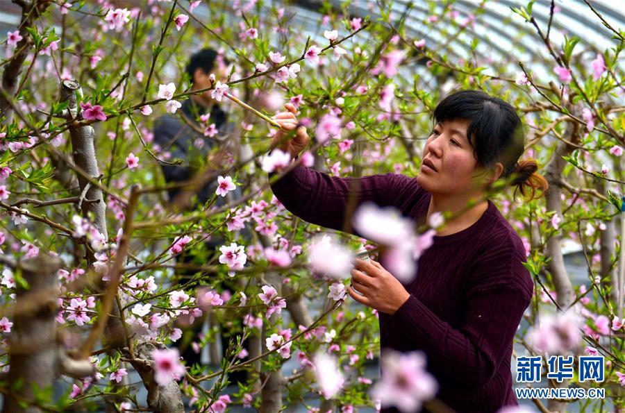2月25日,果農(nóng)在邯鄲市邯山區(qū)碩果春農(nóng)業(yè)園大棚內(nèi)為桃花授粉。 隨著氣溫升高,河北省邯鄲市邯山區(qū)碩果春農(nóng)業(yè)園大棚內(nèi)的桃花競相綻放。 新華社記者 王曉 攝