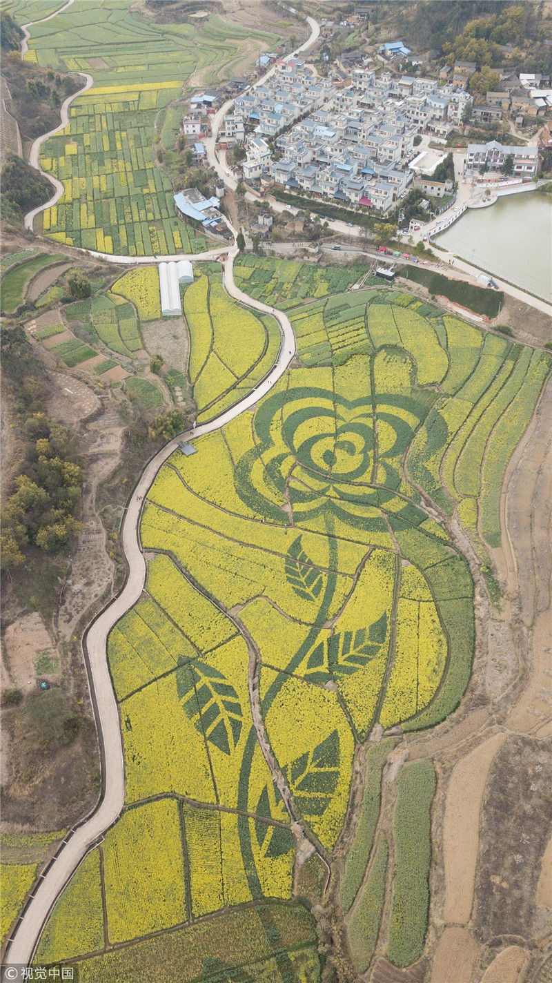 2019年近日,在云南省安寧市山口村,油菜花田里“長(zhǎng)出”一朵巨大的“山茶花”,吸引游客到此觀賞拍照。圖為3月1日,航拍油菜花田中的山茶花圖案。劉冉陽(云南分社)/中新社/視覺中國