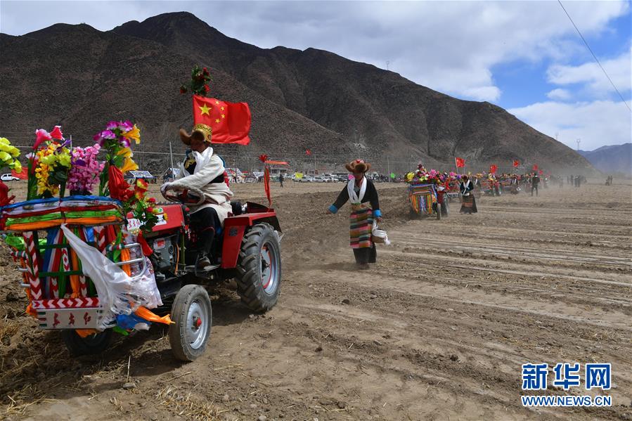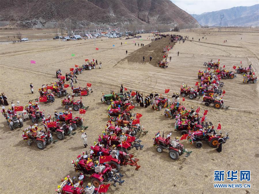 3月16日拍攝的拉薩市達(dá)孜區(qū)唐嘎鄉(xiāng)開耕儀式現(xiàn)場(chǎng)。 當(dāng)日,西藏各地男女老幼身著節(jié)日盛裝,駕著一輛輛由彩旗、花朵裝扮一新的拖拉機(jī),涌向待墾的農(nóng)田,載歌載舞迎來一年一度的開耕儀式。 新華社記者 張汝鋒 攝