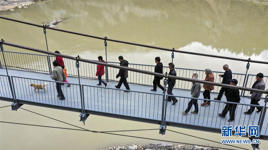3月25日,略陽縣徐家坪鎮(zhèn)藥木院村村民走在新修的鋼結(jié)構(gòu)吊橋上。 新華社記者陶明攝