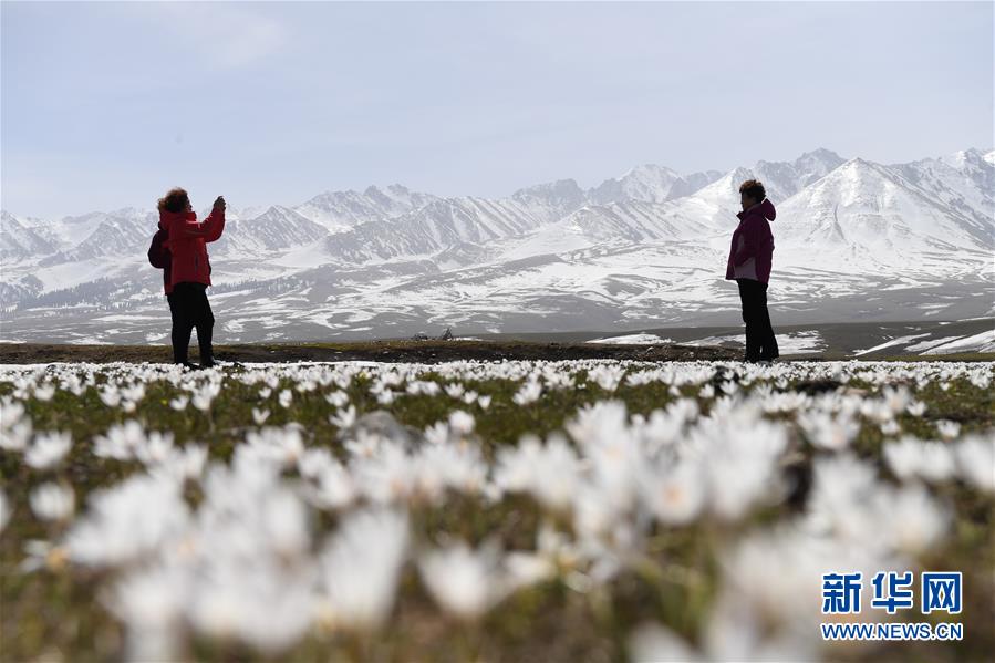 4月4日,游客在新疆那拉提景區(qū)雪山腳下盛開(kāi)的野百合中拍照。新華社記者 沙達(dá)提 攝