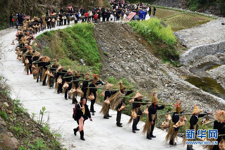 4月7日,苗族群眾挑著祭品走在祭“巫耶”儀式途中。4月6日至7日,在貴州省黔東南苗族侗族自治州劍河縣觀么鎮(zhèn)新民村和新合村,來(lái)自劍河縣和三穗縣的苗族同胞歡聚一堂,通過(guò)民族歌舞展演、非遺手工藝展示、千戶(hù)祭“巫耶”、跳蘆笙舞等形式,與來(lái)賓一起歡慶2019年高雍苗族“三月三”民俗文化節(jié)。 新華社記者 楊文斌 攝