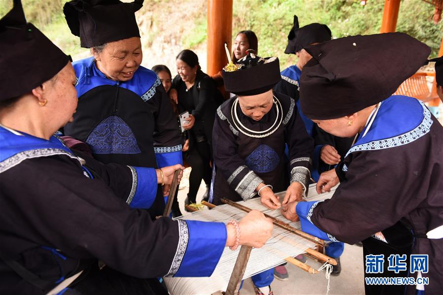 苗族群眾在展示手工織布(4月6日攝)。4月6日至7日,在貴州省黔東南苗族侗族自治州劍河縣觀么鎮(zhèn)新民村和新合村,來自劍河縣和三穗縣的苗族同胞歡聚一堂,通過民族歌舞展演、非遺手工藝展示、千戶祭“巫耶”、跳蘆笙舞等形式,與來賓一起歡慶2019年高雍苗族“三月三”民俗文化節(jié)。 新華社記者 楊文斌 攝