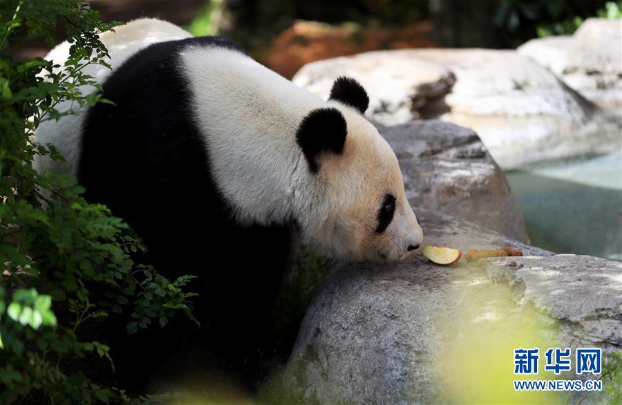 4月6日,在美國(guó)圣迭戈動(dòng)物園熊貓館,大熊貓“白云”在覓食。新華社記者李穎攝