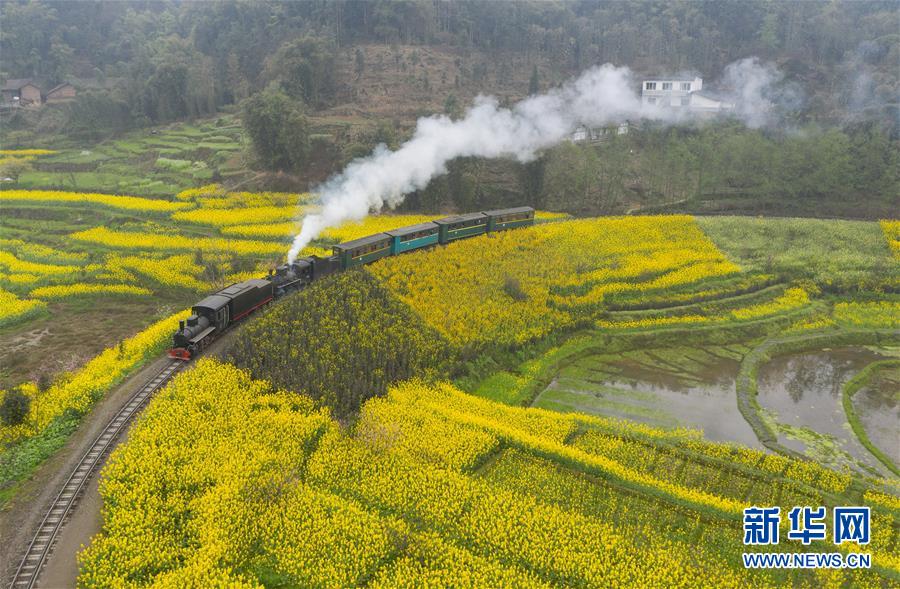 3月20日,一列嘉陽(yáng)小火車在油菜花叢中穿行。