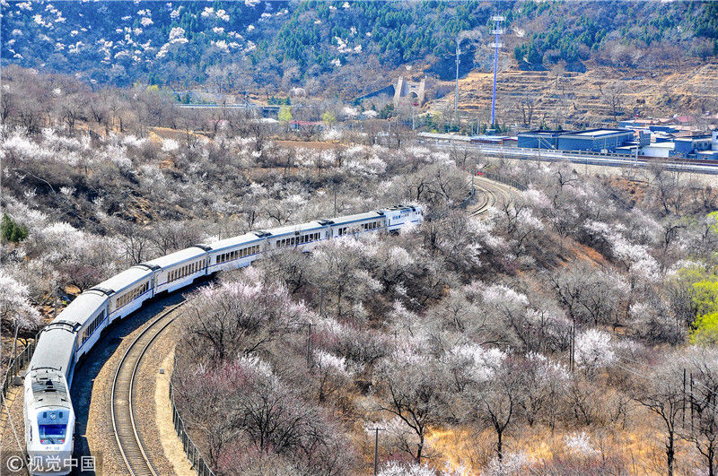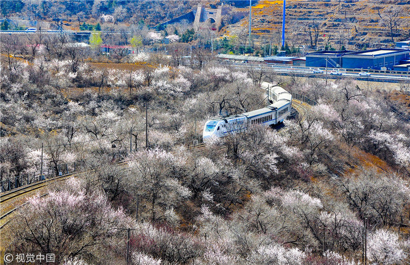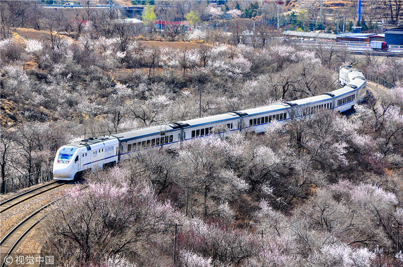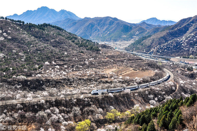 2019年3月22日,北京居庸關(guān)附近的山花盛開,S2線列車穿行在花海之中,構(gòu)成一幅美麗的畫面。時(shí)永平/千龍圖像/視覺中國(guó) 編輯/陳進(jìn)