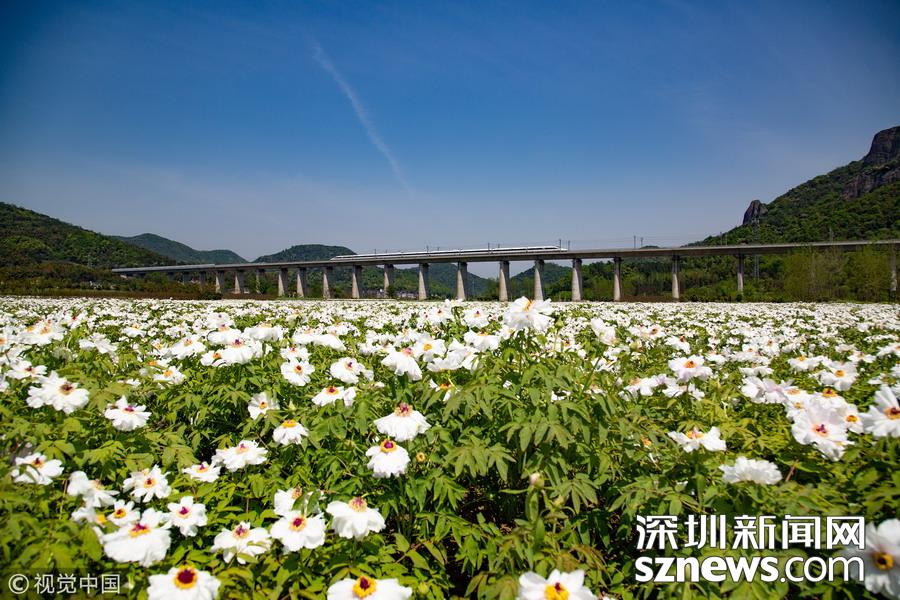 2019年4月8日,一列高鐵列車從京福高鐵安徽銅陵段一片盛開的鳳丹花海中駛過(guò)。隨著氣溫回升,安徽省銅陵市境內(nèi)的鳳丹競(jìng)相綻放,高鐵列車穿行其間,成為春日里一道美麗的風(fēng)景線。