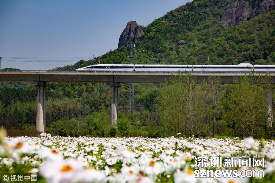 2019年4月8日,一列高鐵列車從京福高鐵安徽銅陵段一片盛開的鳳丹花海中駛過。隨著氣溫回升,安徽省銅陵市境內(nèi)的鳳丹競相綻放,高鐵列車穿行其間,成為春日里一道美麗的風(fēng)景線。