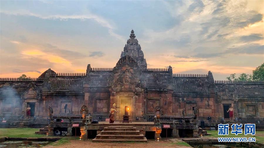 4月5日,在泰國武里南府,當?shù)嘏源虬绯上膳臉幼釉谂羶z隆寺前跳舞。 一年一度的“登帕儂隆山節(jié)”在泰國東北部毗鄰柬埔寨的武里南府帕儂隆山舉辦。當?shù)厝艘怨叛b巡游展示獨特的傳統(tǒng)文化,希望能吸引更多外國游客、促進當?shù)芈糜螛I(yè)發(fā)展。 新華社記者 楊舟 攝
