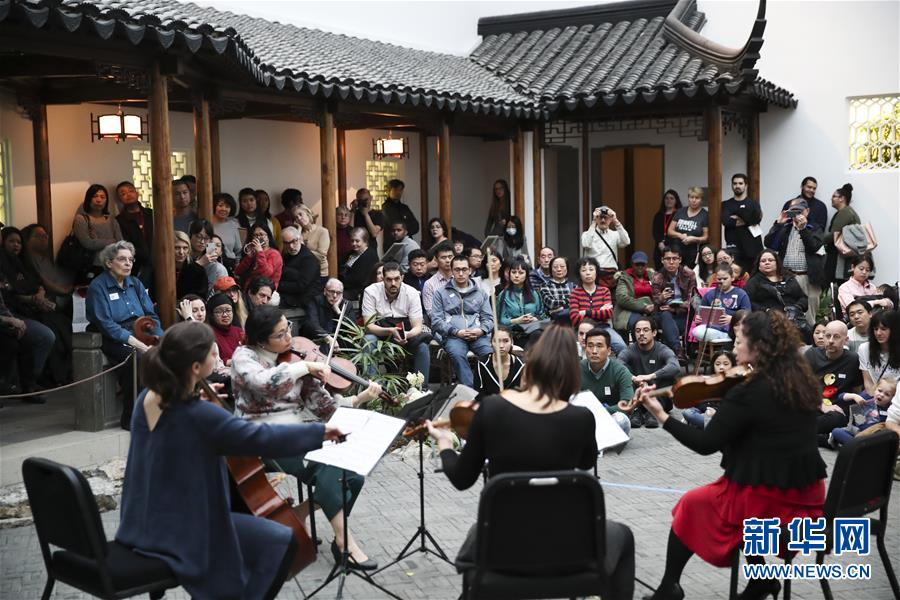 2018年2月24日,人們在美國紐約大都會(huì)博物館“明軒”欣賞演出,慶祝新春佳節(jié)。中式庭院“明軒”是中國第一個(gè)落戶海外的蘇式園林,位于美國紐約大都會(huì)博物館二層的玻璃天棚下,是模仿中國蘇州網(wǎng)師園中的“殿春簃”設(shè)計(jì)建造而成的。“明軒”由蘇州市園林管理局承建,所用的磚、瓦、木材、構(gòu)件等在中國備好后,由20余名中國工程師和工匠在美國組裝。 新華社記者王迎攝