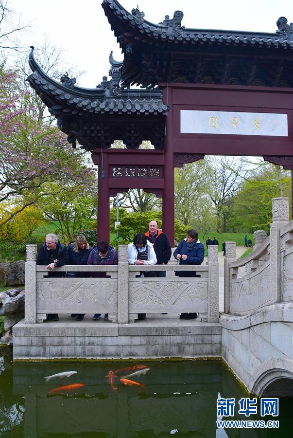 2019年4月13日,在德國曼海姆,游客在中式園林“多景園”內(nèi)觀魚?!岸嗑皥@”位于曼海姆市路易森公園內(nèi),占地約6000平方米,建筑面積約1500平方米,是目前歐洲最為完整的中國古典園林建筑群落之一。 新華社記者逯陽攝