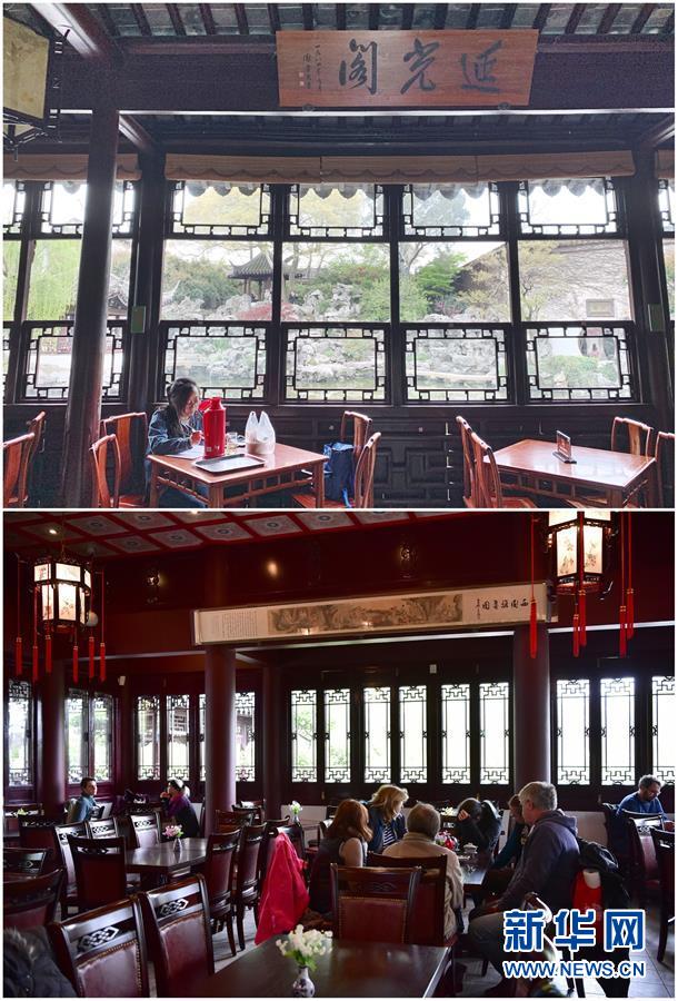 這張拼版照片展示的是:上圖,2019年4月2日,在中國蘇州藝圃,一名女子在延光閣內(nèi)學(xué)習(xí)(新華社記者杜涓涓攝);下圖,2019年4月13日,游客在德國曼海姆中式園林“多景園”內(nèi)的“多景樓”飲茶休憩(新華社記者逯陽攝)。