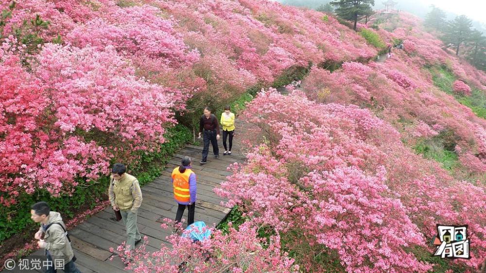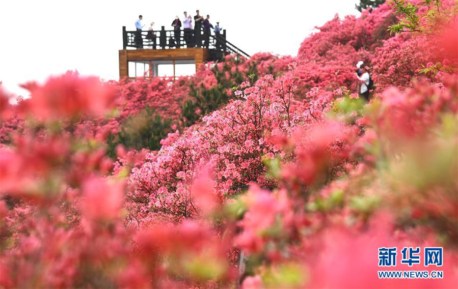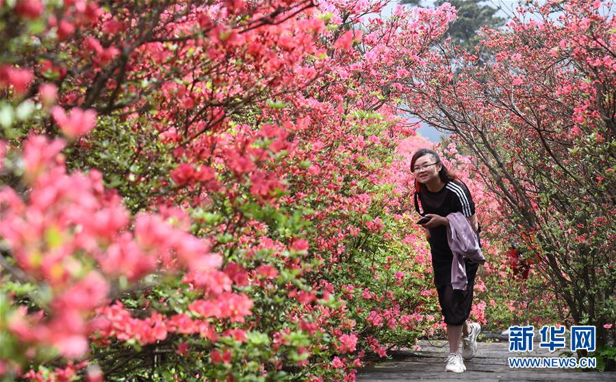 4月25日,游客在龜峰山杜鵑花海中游玩。 近日,湖北省麻城市龜峰山的10萬(wàn)畝古杜鵑盛開(kāi),大量游客前來(lái)賞花觀景。 新華社記者 程敏 攝