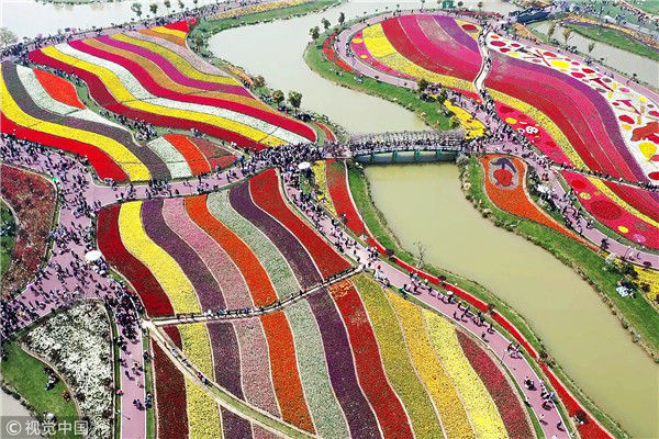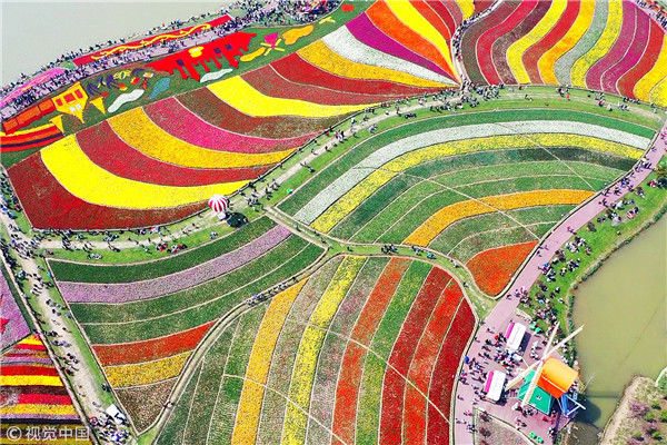 2019年4月6日,江蘇鹽城市大豐荷蘭花海的300萬(wàn)株郁金香隨風(fēng)盛開(kāi),吸引了眾多市民和游客前來(lái)觀賞。從空中看,一片片彩色的郁金香花田仿佛巨幅彩帶,將數(shù)百畝花海裝扮得分外美麗。楊素平/視覺(jué)中國(guó)