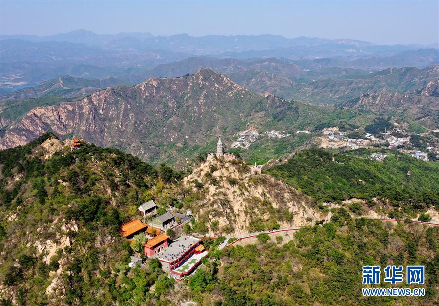 定光佛舍利塔矗立在盤(pán)山主峰掛月峰上(5月2日無(wú)人機(jī)攝)。新華社記者 岳月偉 攝