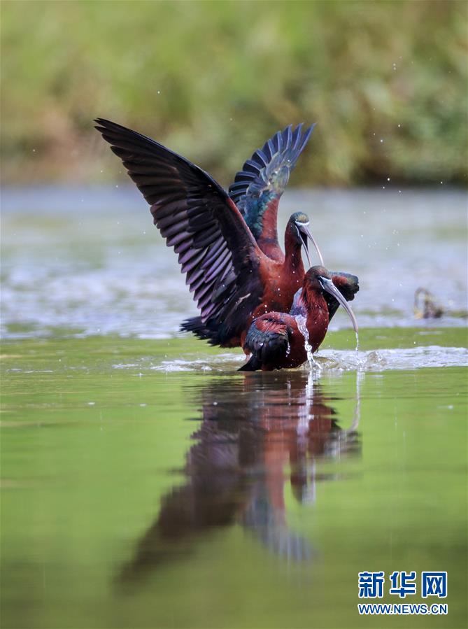 這是在漢江濕地公園嬉水的2只彩鹮(5月4日攝)。 近日,國家二級保護動物彩鹮現身陜西省漢中市漢江濕地公園濂水河與漢江交匯處。 據陜西師范大學生命科學院教授于曉平介紹,彩鹮在世界上的分布比朱鹮還要少,這幾年在云南發(fā)現得多一些,這3只彩鹮現身漢江濂水河畔,是陜西首次發(fā)現彩鹮蹤跡。 據了解,彩鹮是國家二級保護動物,屬鵜形目鹮科,體羽大部為青銅栗色,是珍稀鳥類朱鹮的“近親”,體型比朱鹮略小。 新華社發(fā)