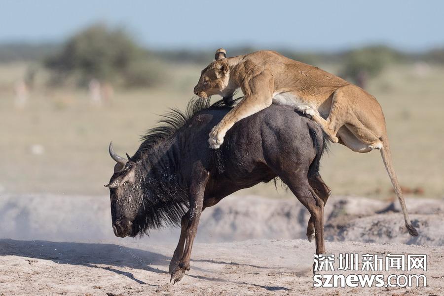 英國攝影師蘇-莫里斯(Sue Morri)在博茨瓦納Nxai Pan國家公園游玩,目睹了一場兇惡母獅獵食角馬的畫面。母獅甚至攀到了角馬背上,想要牢牢遏制住到手的“美餐”。強(qiáng)壯的角馬努力地與母獅抗?fàn)?,竭力想要保住自己的性命,但最終還是不敵母獅被拿下,最后成了母獅孩子們的盤中餐。