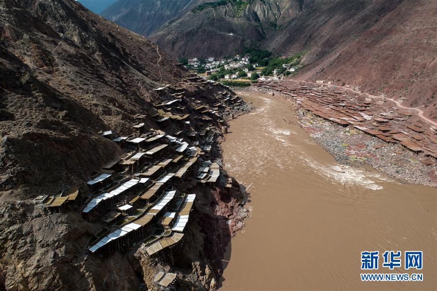 這是西藏芒康縣納西民族鄉(xiāng)的古鹽田景觀(5月22日無人機拍攝)。 位于西藏昌都芒康縣瀾滄江畔的古鹽田,至今仍保持最原始的手工曬鹽方式。據(jù)史料記載,唐朝時期當?shù)鼐烷_始曬鹽。鹽田在瀾滄江兩岸依山而建,由多根木柱搭架,架上用透水性強的泥土鋪成平面夯實,當?shù)鼐用駨臑憸娼系柠}井、鹽池中取出鹵水倒入鹽田,經(jīng)陽光蒸曬、風干,結(jié)晶成鹽。遠遠望去,鹽田錯落有致,田中鹵水宛若鏡面,形成壯麗奇觀。 新華社記者 李鑫 攝