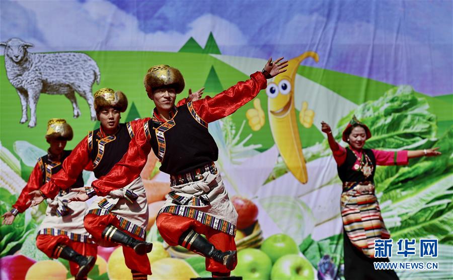 5月28日,演員在白朗縣第九屆果蔬采摘節(jié)上表演。 近日,西藏日喀則市白朗縣1.46萬畝瓜果蔬菜喜獲豐收。百姓們在縣里的豐登廣場載歌載舞,慶祝白朗縣第九屆果蔬采摘節(jié)。 新華社記者 張汝鋒 攝