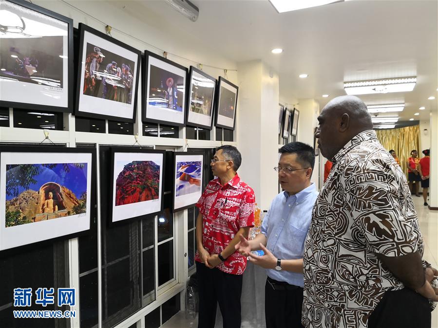 5月29日,在斐濟蘇瓦,中國駐斐濟大使錢波(中)與斐濟中國文化中心主任鄧先富(左)陪同嘉賓觀看展出的精美圖片。 為期5天的中國旅游文化周及美食節(jié)活動29日晚在斐濟首都蘇瓦拉開帷幕,來自中斐兩國的約200名嘉賓出席了開幕式。開幕式上,嘉賓們觀看了反映中國寧夏自然風光和人文風貌的精美圖片以及中國非物質(zhì)文化遺產(chǎn)展,來自寧夏的藝術家表演了精彩文藝節(jié)目,來自江蘇的大廚為嘉賓帶來了淮揚菜。 新華社記者 張永興 攝