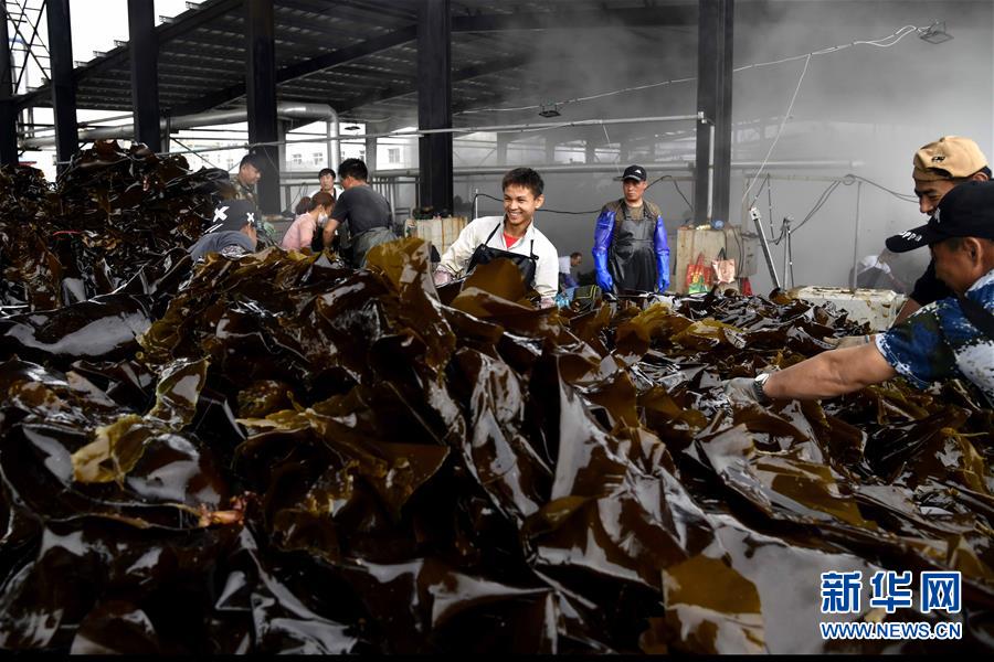 6月5日,在榮成市尋山街道青魚灘村,漁民在收獲海帶。 近日,山東省榮成市迎來(lái)海帶收獲季。據(jù)悉,榮成市海帶養(yǎng)殖面積14.5萬(wàn)畝,年產(chǎn)海帶43.3萬(wàn)噸以上。 新華社記者郭緒雷攝
