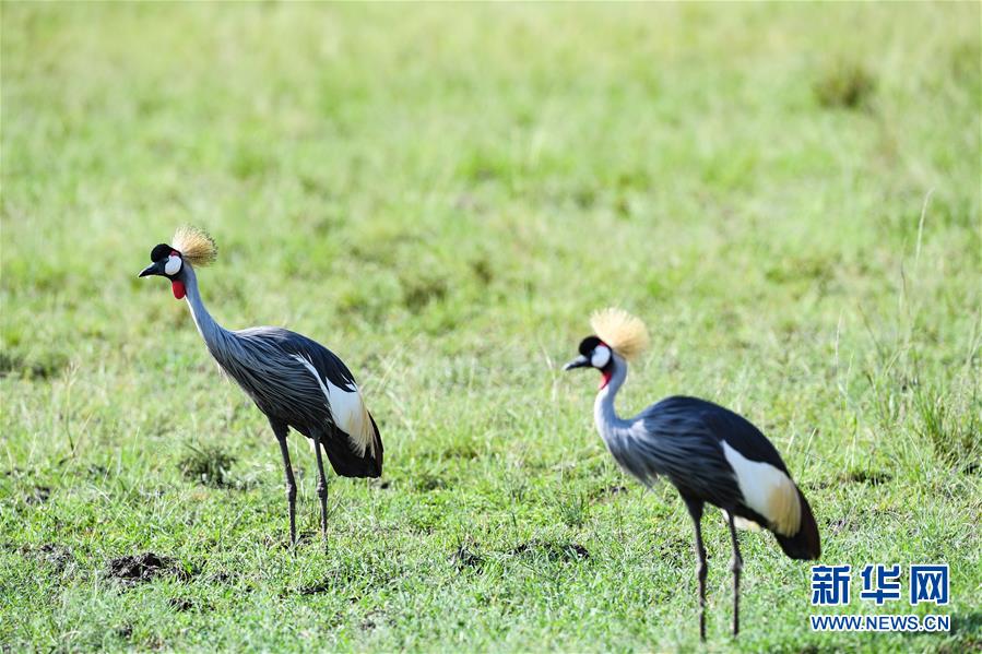 6月17日,在肯尼亞馬賽馬拉國家保護區(qū),兩只冕鶴在草原上覓食。 新華社記者 李琰 攝
