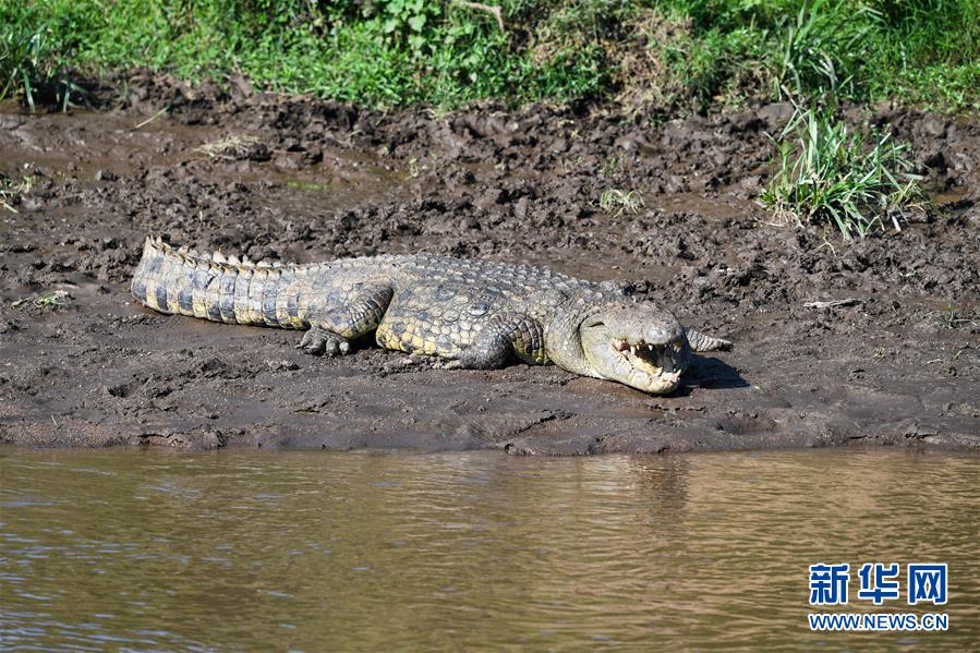6月17日,在肯尼亞馬賽馬拉國家保護區(qū),一條鱷魚在水邊休息。 新華社記者 李琰 攝