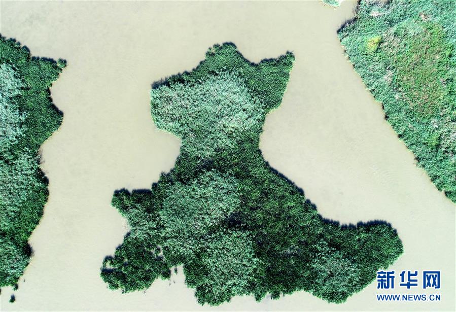 這是天津市寧河區(qū)七里海濕地內蘆葦和水面形成的圖案(6月22日無人機拍攝)。