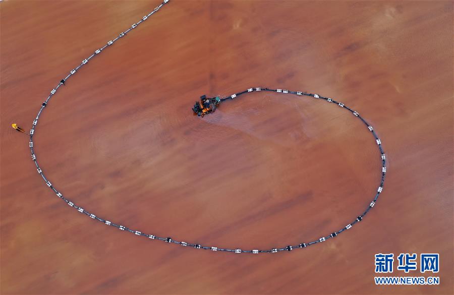 7月3日,唐山海港經(jīng)濟(jì)開發(fā)區(qū)大清河鹽場的工人在操作機(jī)械設(shè)備收獲春鹽(無人機(jī)拍攝)。