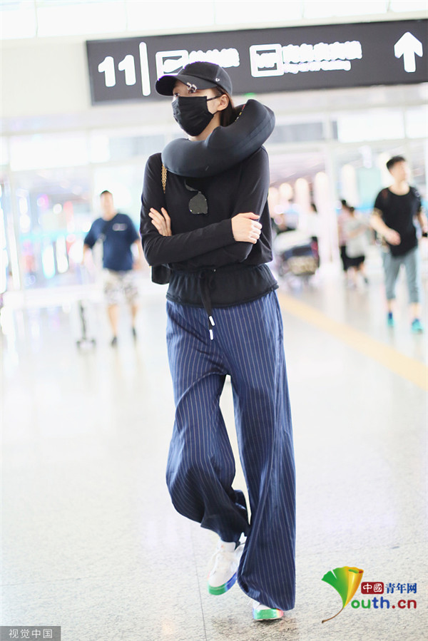 關(guān)曉彤淡定抱臂行走 脖子上掛U型枕毫無偶像包袱