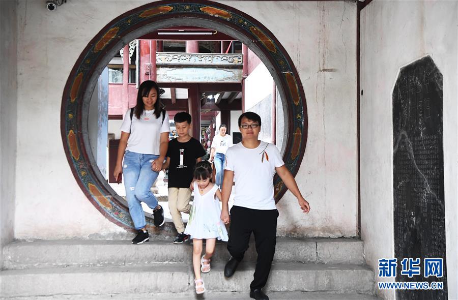 游客在張飛廟游覽(7月31日攝)。云陽縣城搬遷時,原在老城對岸的張飛廟,也一磚一瓦地搬遷到了與云陽新縣城一江之隔的新址。