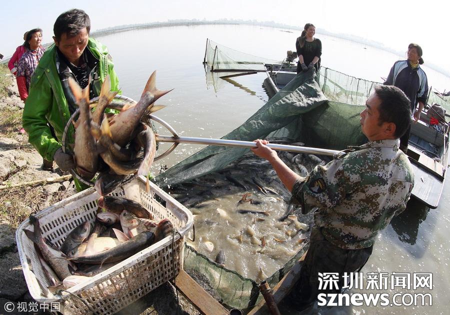 江蘇揚州,邗江區(qū)公道鎮(zhèn)南湖村南湖水域,專業(yè)捕撈隊人員已集結(jié)到胡登強養(yǎng)殖戶家魚塘進行捕撈作業(yè)。