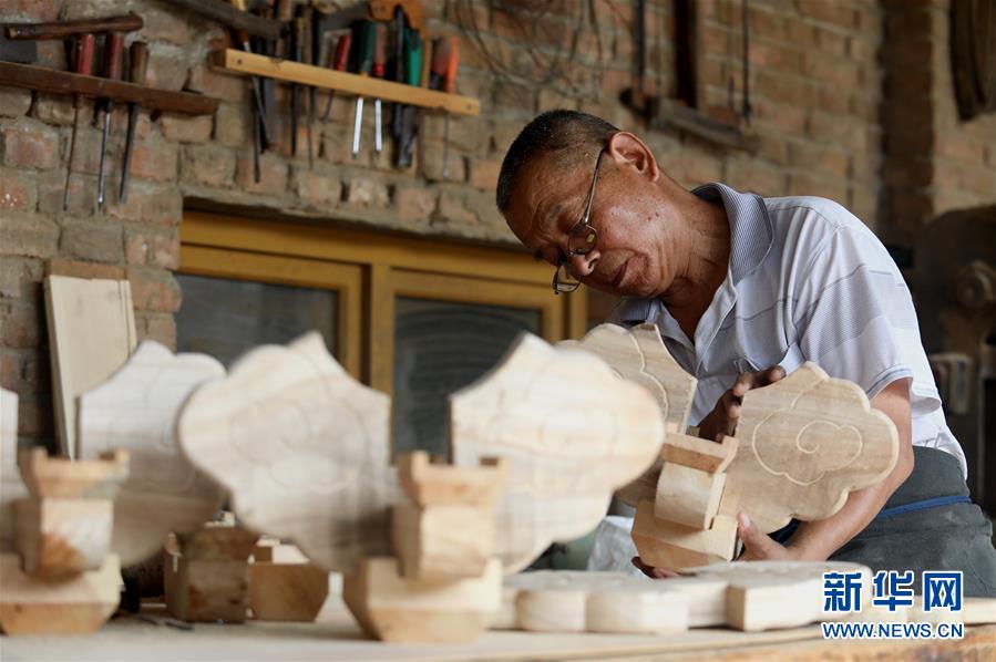 8月7日,在石家莊市井陘礦區(qū)橫西村,韓保元在檢查斗拱。 新華社記者駱學峰攝