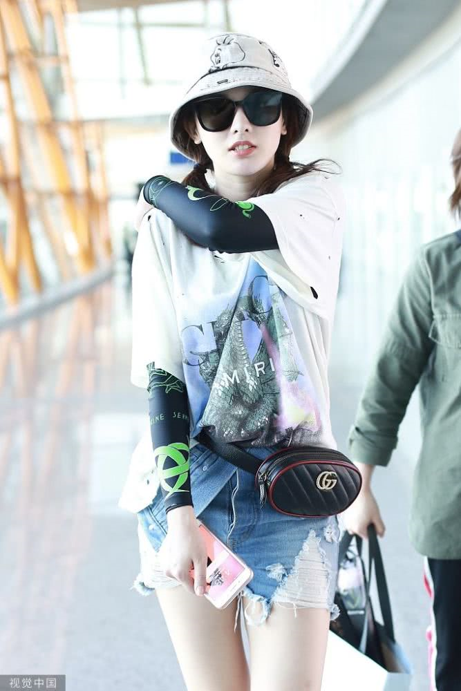 內(nèi)地女星彭小苒現(xiàn)身機(jī)場,穿印花T恤牛仔短褲,白色馬丁靴很時髦