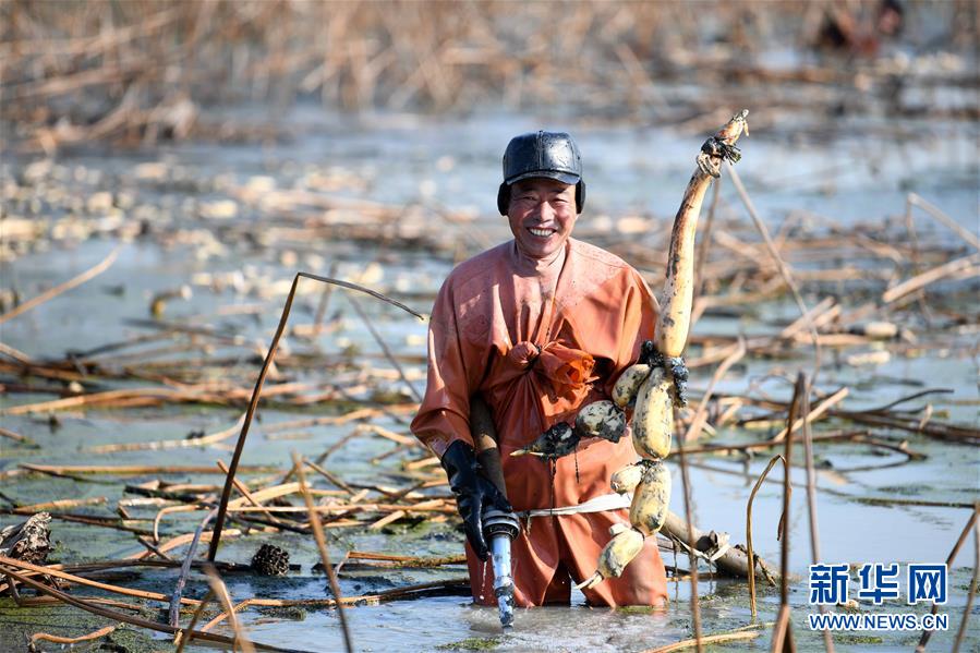 來自淮南的挖藕人王公平在肥西縣豐樂鎮(zhèn)一蓮藕種植基地收獲蓮藕。新華社記者劉軍喜攝