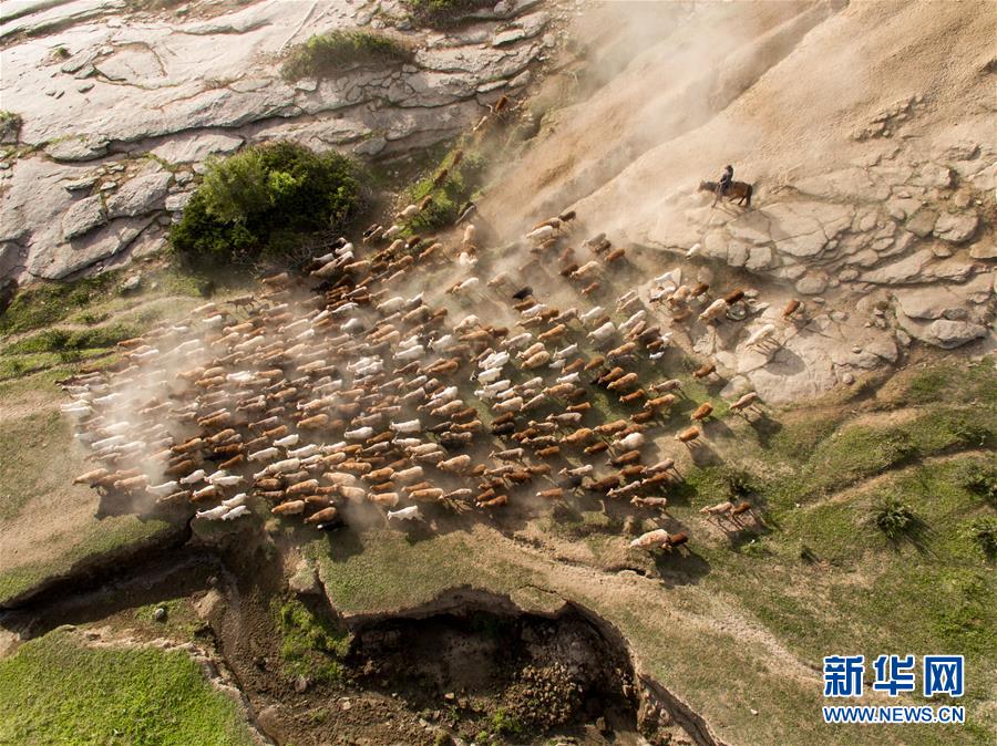 新疆阿勒泰地區(qū)福海縣牧民趕著牲畜向夏季牧場遷徙(6月6日無人機拍攝)。新華社記者丁磊攝