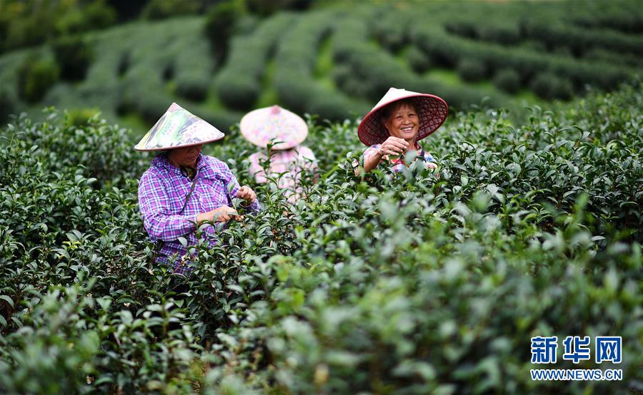 五指山市水滿鄉(xiāng)毛腦村貧困戶王金花(右一)在五指山椰仙茶園采茶,她在2012年進(jìn)入茶園工作,2016年脫貧(2018年11月15日攝)。新華社記者郭程攝