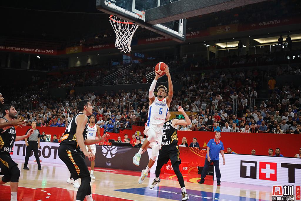 一位多米尼加隊的球員正在上籃。