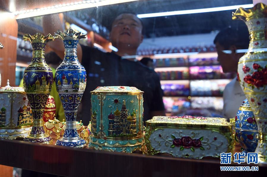9月4日,在新疆塔城地區(qū)巴克圖口岸,顧客在絲路文化商品城內(nèi)選購(gòu)商品。 新華社記者沙達(dá)提攝