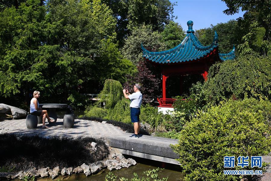 8月24日,在比利時(shí)布呂熱萊特市,游客在天堂動(dòng)物園的“中國(guó)園”拍照留念。新華社記者 鄭煥松 攝