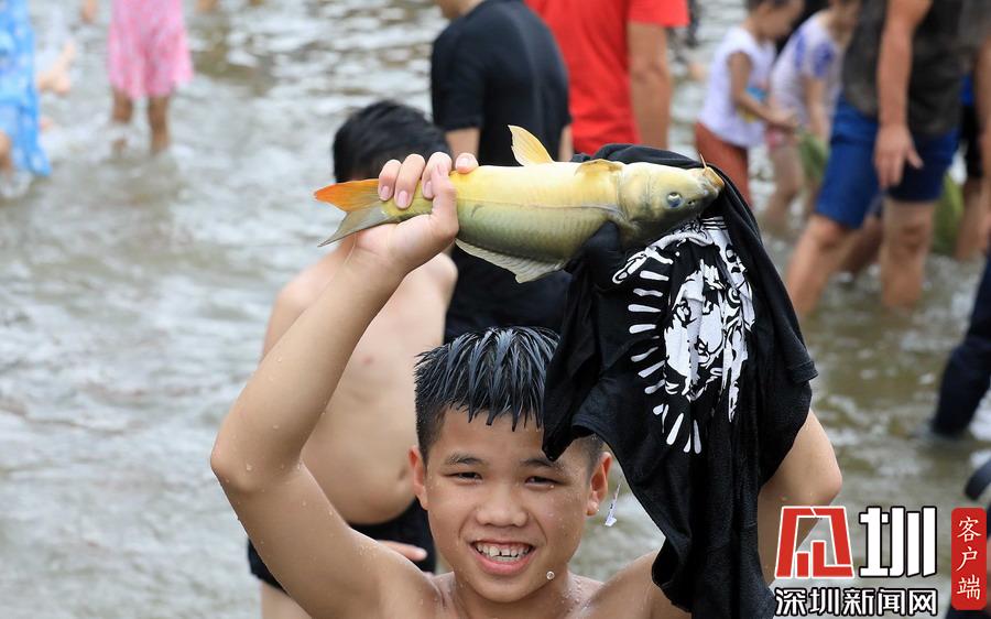 一名小朋友在“鬧魚”活動中抓得一條活魚。