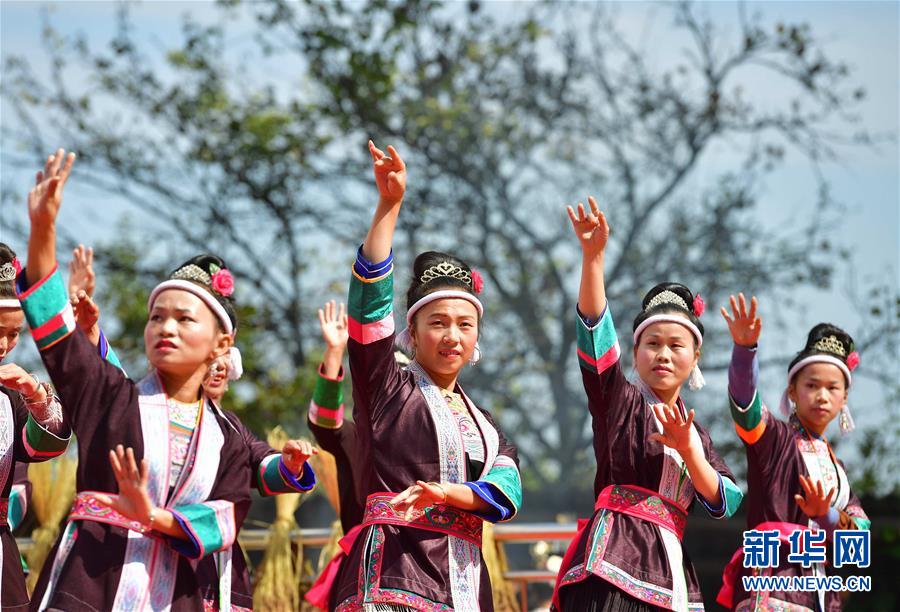 10月28日,在廣西融水苗族自治縣拱洞鄉(xiāng)龍令村,侗族婦女在表演歌舞。新華社記者 黃孝邦 攝