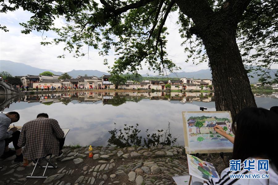 4月24日,繪畫愛(ài)好者在宏村風(fēng)景區(qū)寫生。新華社記者任鵬飛攝