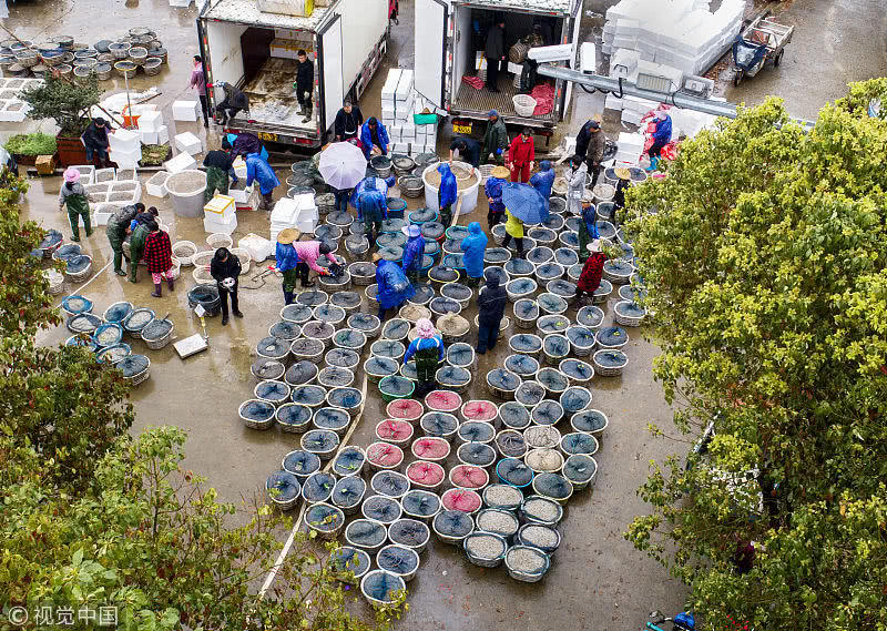 浙江臺州三門縣花橋鎮(zhèn)柵下村的文化禮堂前,村民們冒雨和商販交易蟶苗,現(xiàn)場一片繁忙。